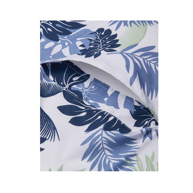 ホワイトの生地にブルー系色のシダ柄でリゾート感溢れるシルエット。