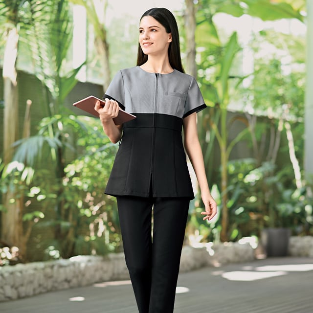パッと目にとまる華のある雰囲気なのに上品なのは細かい千鳥柄を取り入れたデザインだから。無地見えする千鳥柄と黒配色が品の良さを醸し出しています。着脱しやすい前開きファスナーに、動かしやすい袖。細部のディティールまでこだわった1着。
