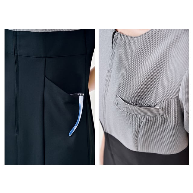 ◇左胸・両脇ポケット付(右のみ二重)、前ファスナー開き、右脇ループ付、胸ポケット内側共布ループ付