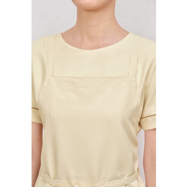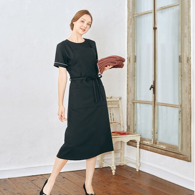 バックスタイルもすっきりキレイ。すっきりとしたシルエットの機能的エプロン。おしりをすっぽりと包み込むデザインなので、バックスタイルを気にする事なく快適。ウエストリボンの裏面にはお洒落なテープがついています。
