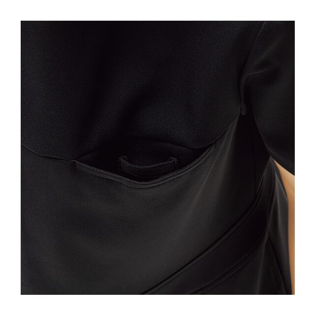 左胸ポケット(ネームループ付)、両脇ポケット、後ろファスナー
