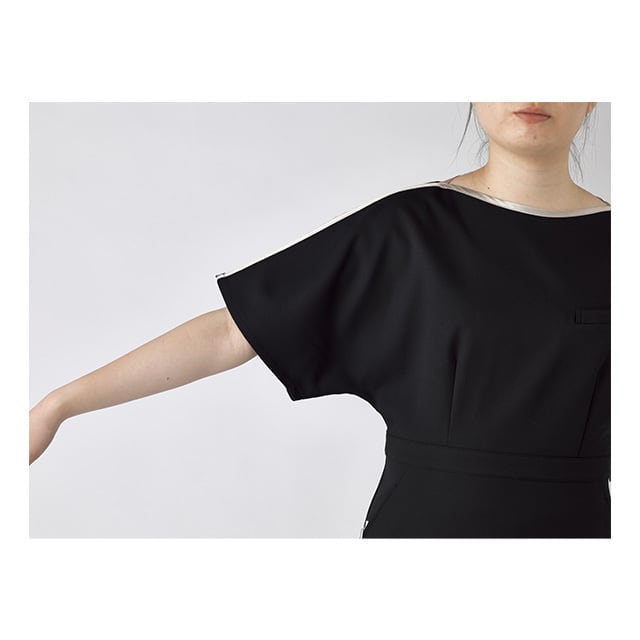 凛としたシルエット、ドルマンスリーブがエレガントな印象を与えるスタイル