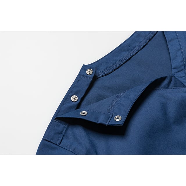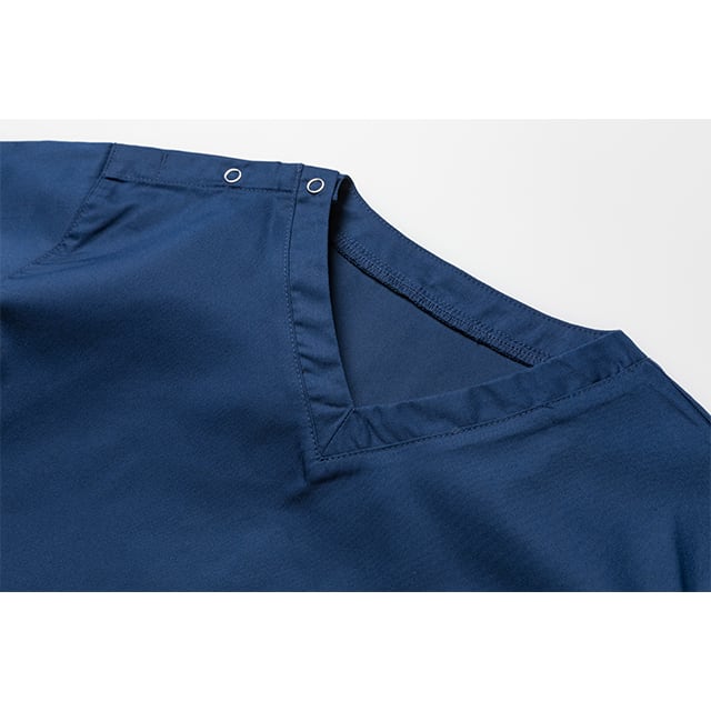 立体的な胸ポケットやガゼット、動きやすい様にゆったりとしたシルエットが特徴の半袖スクラブ。